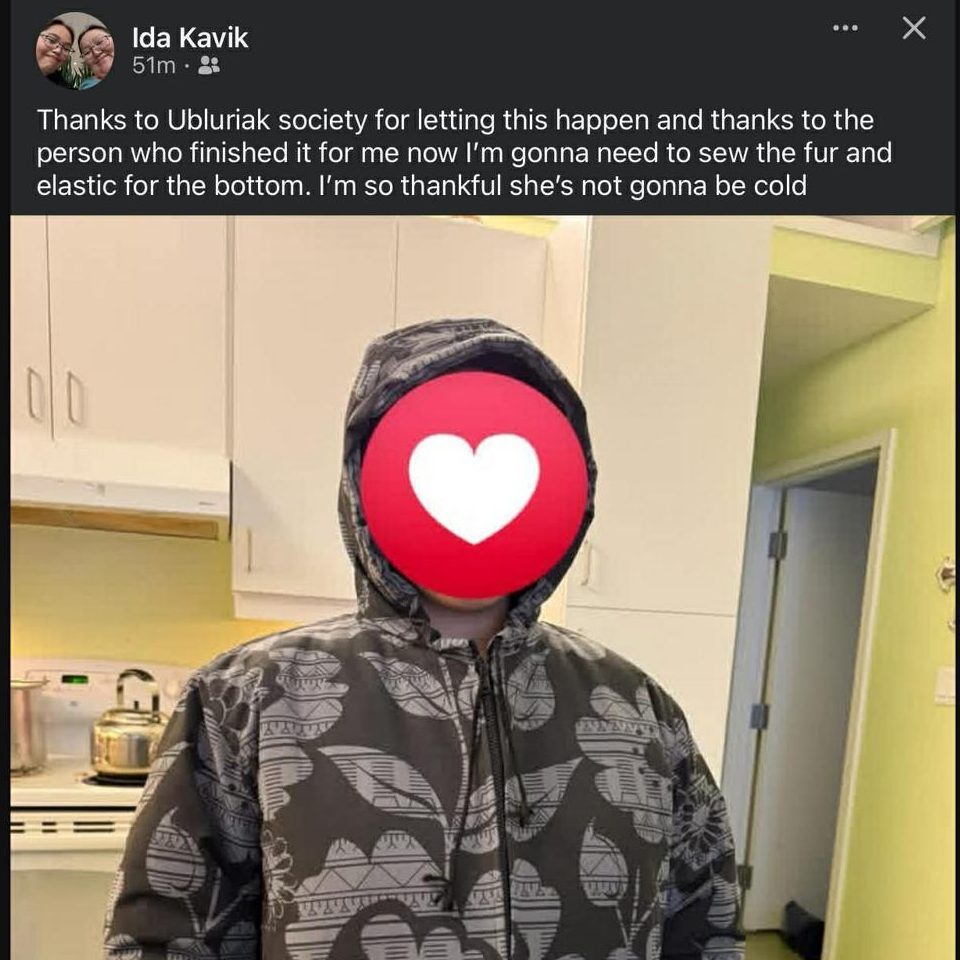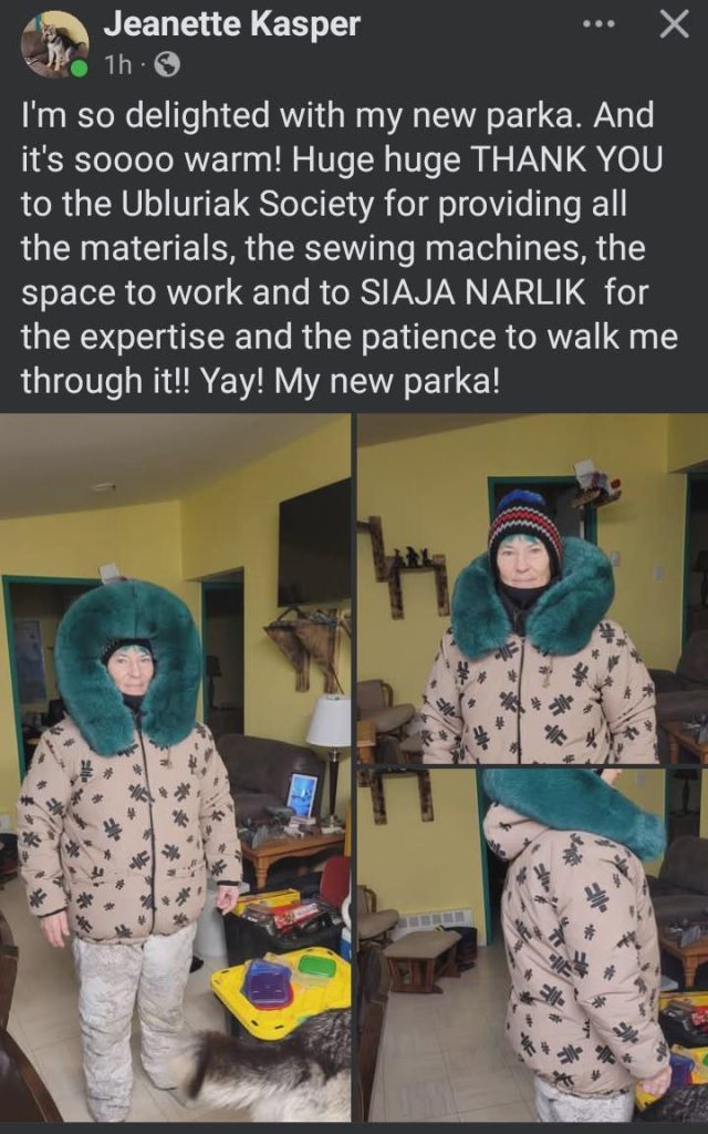 Jeanette Kasper couldn’t contain her excitement when she shared photos of her finished parka, calling it “soooo warm” and giving a big thank you to Ubluriak Society and Siaja for guiding her through every step. Ida Kavik also posted about the experience, sharing how grateful she is that her loved one now has a warm parka to wear, with just the fur and elastic left to finish up at home.